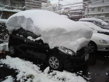 写真は1月15日朝、長岡駅付近の駐車場です。一昨日から駐車していた車の屋根はご覧の通り。目測で60〜70cm程度かと。昨日の午後、寒さがちょっと緩んだので、これでも昨日の朝よりは積雪量が3/4位になってます。他人の車ながら、サスペンションやタイヤが痛みはしないかと心配です。