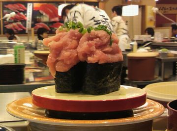さて、相棒と広報センターで2時間ほど遊んだ後、その近所にある回転寿司店に入りました。何かを頼むと「がってん承知!」と元気なかけ声が返ってくる回転寿司店です。回っている寿司も時々元気なのが回ってまして、時には写真のような超大盛りネギトロ軍艦巻きが・・・( ̄△ ̄;