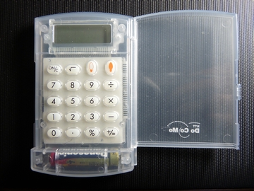 とある集まりで、ビンゴゲームの景品としていただいた電卓です。もらったときは「イマドキ、乾電池(単四1本)で動く電卓かよ!」と、驚いたりあざけったりしたのでありました。