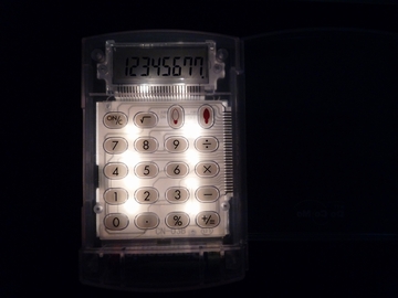 しかし、こいつが実力を発揮するのは闇夜の世界であります。電卓上のランプのボタンを押すとホラ!闇夜に浮かび上がる電卓。これで真っ暗闇でも橋梁の強度計算や年末調整の計算が出来るのです。