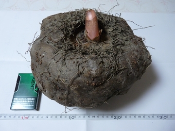我が家の畑で採れたこんにゃくいも(3年もの)であります。普通なら三年ものといってもドンブリ一杯程度の大きさなのですが、このコンニャクイモは直径約30センチ、重量4kg以上。破格の大きさに育ってくれました。まさに「通常の3倍」と言える大きさです。あ、赤くはありませんが(謎)。