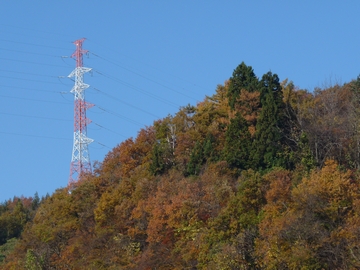 で、余った時間でお散歩です。晩秋の紅葉はまだきれいです。きれいな紅葉にはきれいな高圧線がよく似合う(ええ?)。