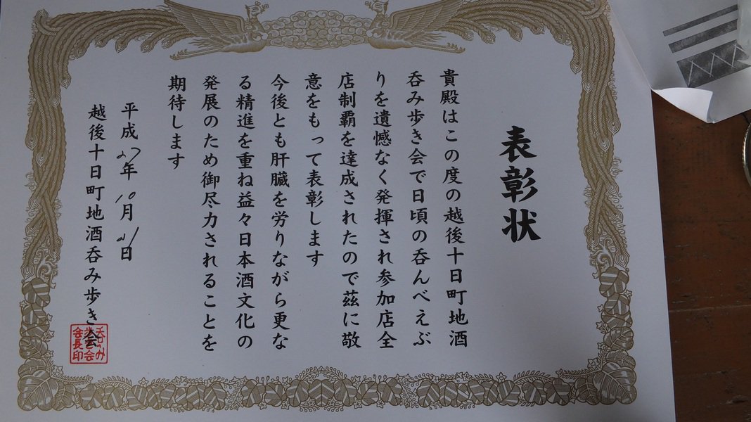 全店巡ったら戴いた表彰状。(酒飲んだらもらえる賞状ってのは貴重品です)