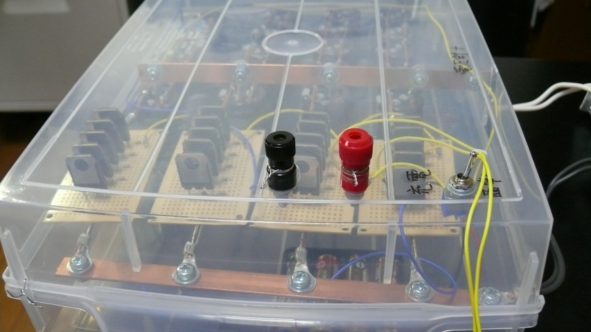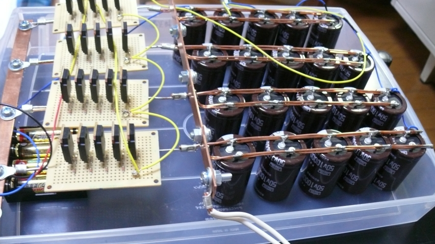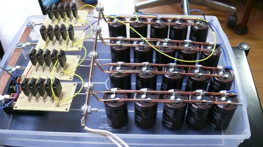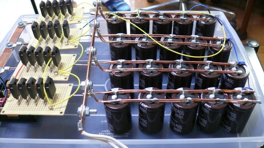 50V10000μFのコンデンサ20ヶと、FETが20個。現物を見るとその力業に感動します。線材も「線」じゃなくて「板」だし。