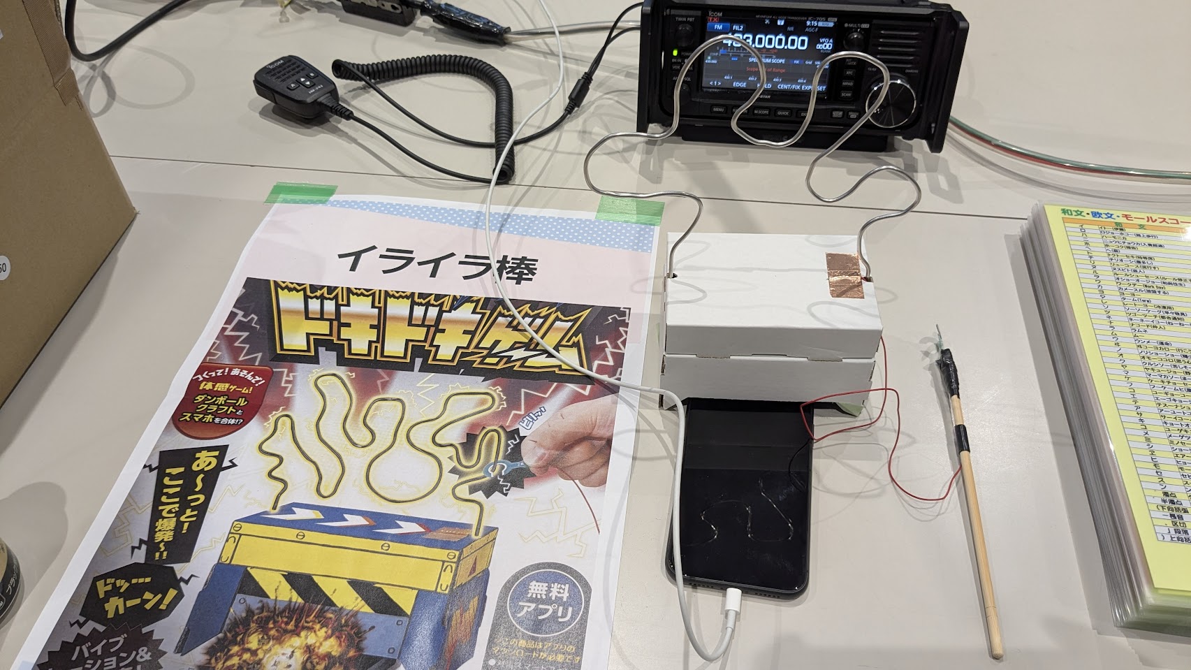 などがメインです。上記で遊んでくれた人にはノベルティグッズやパンフレットを渡しています。今回の「その他」は昔懐かし「電撃イライラ棒」でした。(写真の二枚目)
