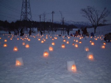栃尾遊雪まつり(2004/02) 豪雪地にはどこでも大なり小なり「雪祭り」というのがありますが、これもその一つで「遊雪祭り」といいます。 遊雪と称しているだけに、雪と戯れることを第一としており、見物するよりも参加することを目的としているようです。 写真はその遊雪祭りの前夜祭である「雪灯り祭り」です。ボランティアの作った巨大ろうそくが、かまくらの中で灯っております。その数、公称1000個。点火もボランティア(っつーか、その場に居合わせた人達)の手により行われました。 ちなみにこの風景で飲む熱燗は旨かったっす。(笑) |