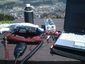 移動運用(2004/04) 春の陽気に誘われて、移動運用して参りました。 場所は(旧)栃尾市中心部にある栃尾城跡であります。 FT-817は確か0.9kgのはず・・・。なのに、予備を含めて単一電池18個。ノートPC、工具、アンテナポール、HFV5、などを集めたらあっというまに10kg! たかだか1キロ程度のハイキングコースを汗だくで上りました。日頃の運動不足が如実に表れました。(苦笑) でも、その成果はありまして、21メガでは出力2.5Wであるにもかかわらず、沖縄や北京からRS59をいただきました。苦労した甲斐があったというモノであります。 こういう運動を毎週続ければスリムになるのでしょうけれど・・・・。 |