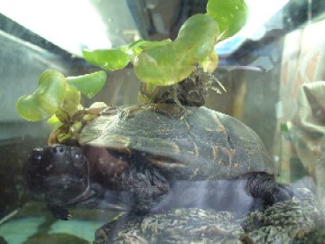 フシギダネ(2004/06) これがポケモンのフシギダネです(嘘)。 うちのクサガメがホテイアオイを甲羅に乗せたまま陸に上がり、日向ぼっこしているの図、であります。 鶴は千年・亀は萬年とか申しますが、クサガメの寿命は60年程度だとか。コイツを飼い始めて14年。あと40年程度は生きることになります。飼い主よりも長生きするペットというのも悔しいですな。(笑) 最近の好物はチクワ。これを一週間に一度腹一杯食わせて水替えするだけですから、飼うのは楽です。でも、何のおもしろみもありませんが・・・。 |