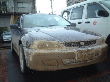悪路と戦う(2004/07) 2004年7月13日未明から降り出した雨は記録的な豪雨となり、新潟地方気象台によると、降り始めから14日午前0時までの雨量は、栃尾で426ミリとなりました。名付けて「7.13水害」 このため刈谷田川の水量が増し、見附や中之島で甚大な被害が出ているほか、(旧)栃尾市でも各地至る所で地滑りが発生しております。 おりしも13日未明から帝都出張だった愛乱度は、道路が分断されたために帰宅に苦労し、結局小出まで出て石峠経由で帰る有様。 14日の出勤も通常コースを通れないため、消防団員の指示により、見附市大田から杉沢まで出て、総合運動公園経由でR8に出るというコースを通ったのであります。 が、そこも沼沢地帯のような道路でして、路面には10センチ以上の泥が積もっております。(田んぼの中の道路) おかげでラリーカーも真っ青な車のできあがりです。ナンバープレートをぼかす必要もありませんね。(笑) これ、どうやって洗おうか??? |