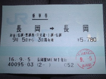 長岡発−長岡行き(2004/09) この季節になると、何故か毎年大塚博堂の「旅でもしようか」という歌を聴きたくなる私です。加えてこの歌を聴くと、無性に只見線に乗りたくなるのであります。(歌の中では海に行っているのに) この歌を聴き続けて20年以上たちました。私ももう中年ですので、そろそろ本物を体験しないと一生行けそうも無いと思い、この9月に勇躍只見線に行って参りました。そのときのキップがこれであります。 長岡駅で「長岡から新津経由の会津若松行きと、只見線経由の帰りのキップ下さい」と言ったら、こういうキップを発券してくれました。 改札や検札のたびに駅員さんが「え?」という目で眺めてくれたので大満足であります。(笑) 良く見ると経由地がちゃんと細かく書いてあります。 私はローカル線を普段は全く利用しない(そもそも栃尾に鉄道が無い)ので、鉄道の旅は家族そろってハイテンションでありました。おかげでお酒もずいぶんと・・・(^_^ゝ あ、お土産は近々お札にもなるという野口英世大先生の名前を冠したお酒(「Dr.野口」純米吟醸の日本酒)であります。大先生の名前を使うだけあって、ビンの形はまるで丸底フラスコであります。 こういう場合、大きさを比較するには、やはり試験管が似合うかと・・・。 |