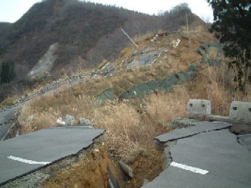 道院キャンプ場への道(2004/12) 何かとお世話になっている道院キャンプ場や十方台がどうなったのか心配で、12月4日に非常食に無線機持参で行って参りました。 もとより車では十方台入り口手前までしか行けませんので、徒歩で行くしかありません。カネタタキの池でも見て帰ってこようと気楽に歩いていたのです・・・が、十方台入り口から1キロほど行ったところでこんな状態に・・・。 ああ、貴重な栃尾の観光資源が・・・・。 (詳細はこちら) |